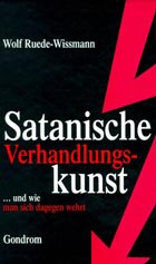 Satanische Verhandlungskunst Wer ist nicht schon einmal ĂŒber den Tisch gezogen worden, weil am Ende die Argumente gefehlt haben, oder der Verhandlungspartner einen miesen Trick angewendet hat? Wolf Ruede-Wissmann verspricht hier Abhilfe. In seinem Buch "Satanische Verhandlungskunst und wie man sich dagegen wehrt" zeigt er auf, auf welche Weise und mit welchen ĂŒblen Tricks in Verhandlungen gearbeitet wird. Dabei wird jede Methode anhand eines Beispiels analysiert. Im zweiten Teil wird dann erörtert auf welche Weise man sich gegen diese Praktiken wehren kann. Dabei kommt er schon am Anfang zu der simplen Grundlage: Wenn die Verhandlungsmethode durchschaut ist, dann wird dieses Vorgehen sogar noch eher eine Falle fĂŒr den, der sie anwendet. Jeder, der nun annimmt, das Buch sei ein Allheilmittel oder eine Zauberwaffe, mit der sich jede Verhandlung spielend gewinnen lĂ€ĂŸt, irrt sich. Hier werden hauptsĂ€chlich Methoden erklĂ€rt, die meist nur durch langes Training zu erlernen sind und außerdem nur begrenzt angewendet werden sollten, um nicht selber nur zu einem nur unfairen Verhandlungspartner zu werden. Insgesamt bleibt das Buch eine recht sinnvolle LektĂŒre, da einige interessante Methoden fĂŒr Verhandlungen erklĂ€rt werden, auf die man von selber nicht unbedingt kommt. Außerdem warnt der Autor selber oft genug vor zu zahlreicher Anwendung dieser Praktiken sowie Anwendung ohne vorheriges Üben. Da weite Teile des Buches mit einer gehörigen Portion Witz und schwarzen Humor geschrieben sind wird das Lesen auch noch zu einem VergnĂŒgen.