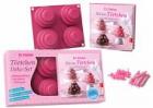 Das Törtchen-Deko-Set besteht aus einem 48 Seiten umfassenden Backbuch, einer Backform aus hochwertigem Silikon, mit der man vier kleine Kuchen oder Törtchen backen kann und 24 kleine Partykerzen.